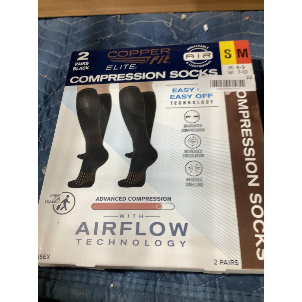 The Copper Fit Elite Compression Socks feature airflow technology, designed to provide comfort and support. These socks are great for travel, offering advanced compression to help reduce swelling and increase circulation.