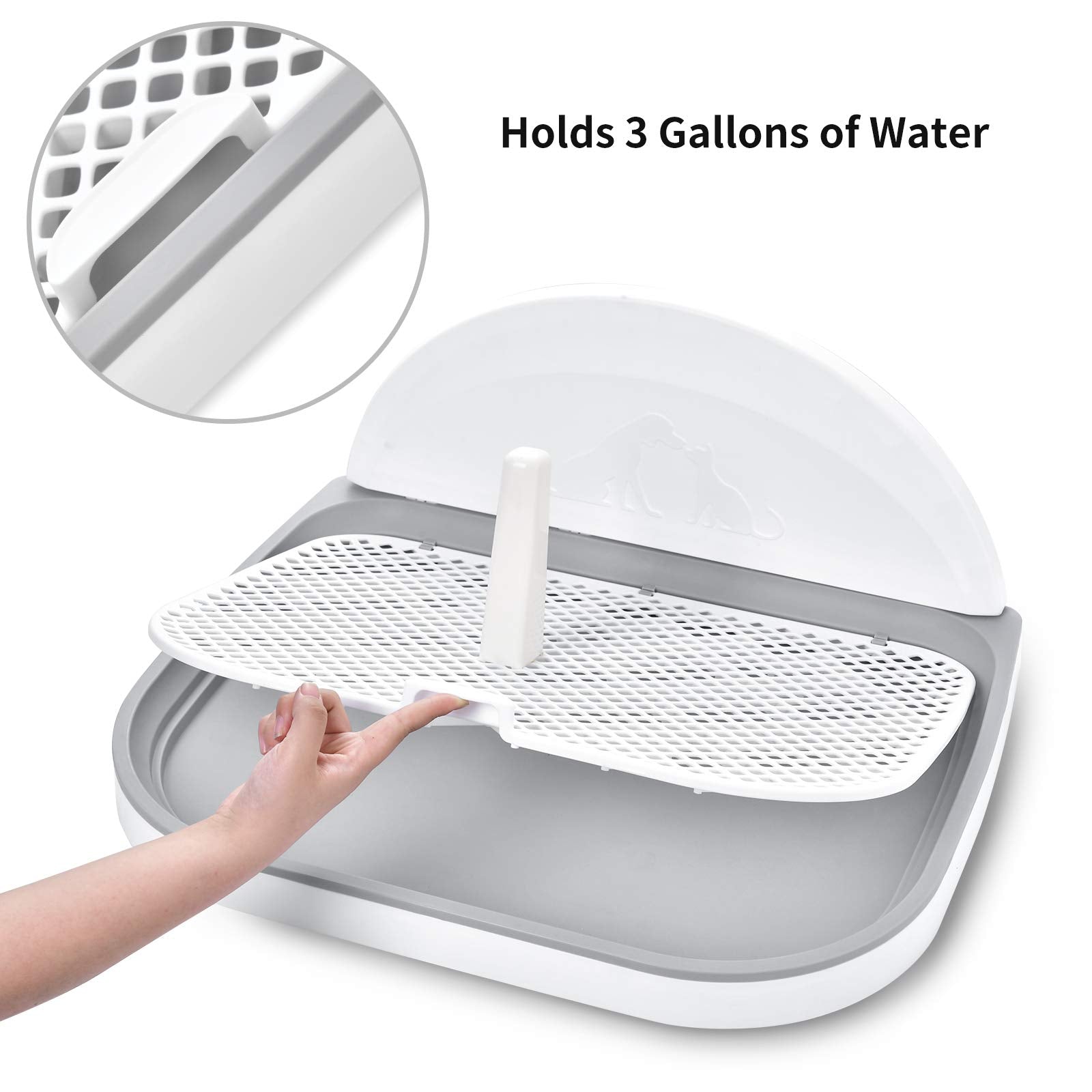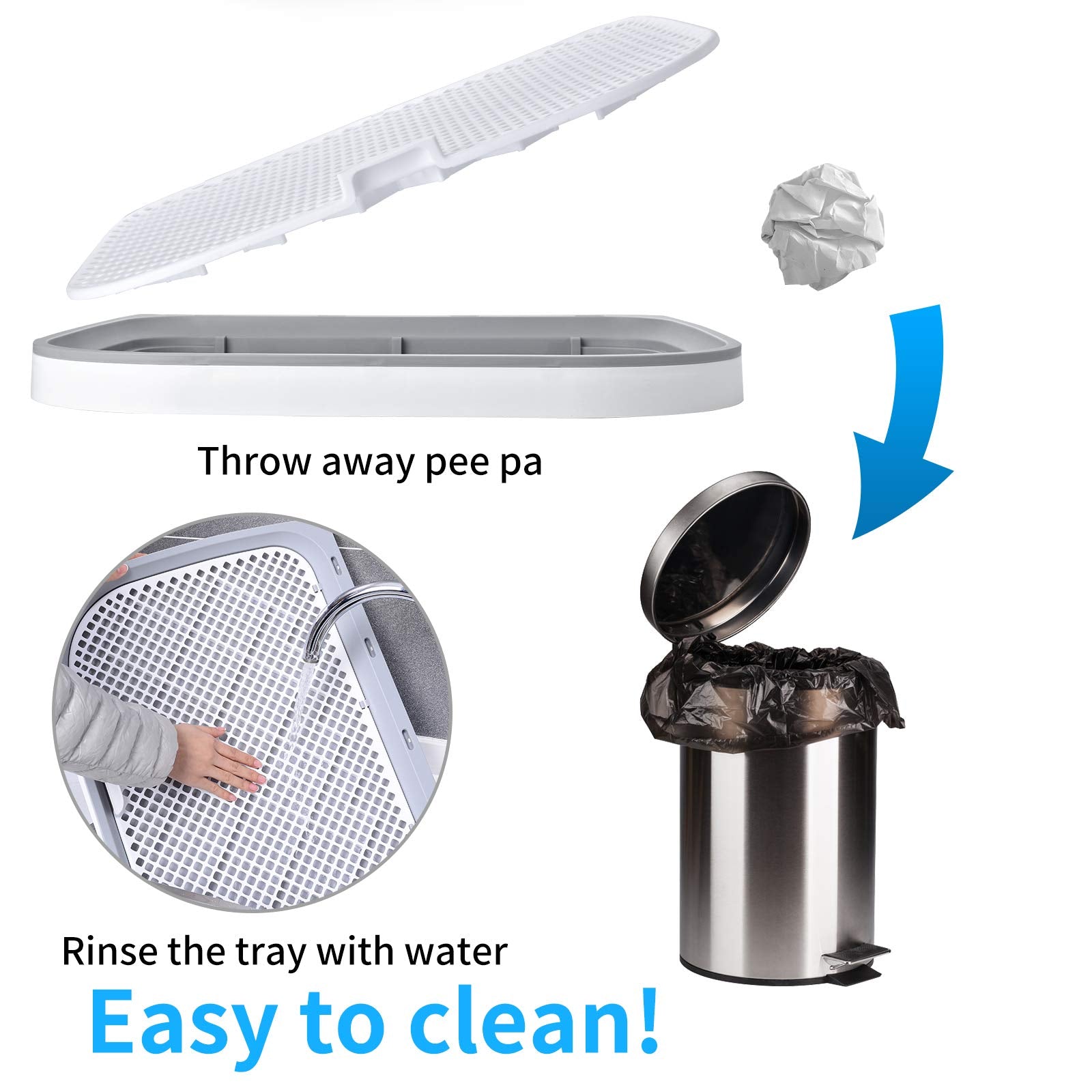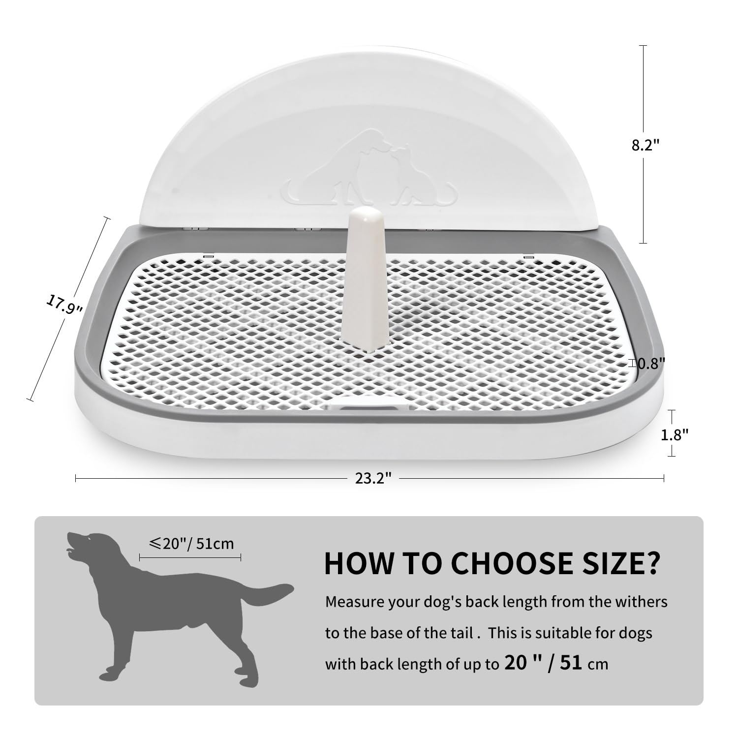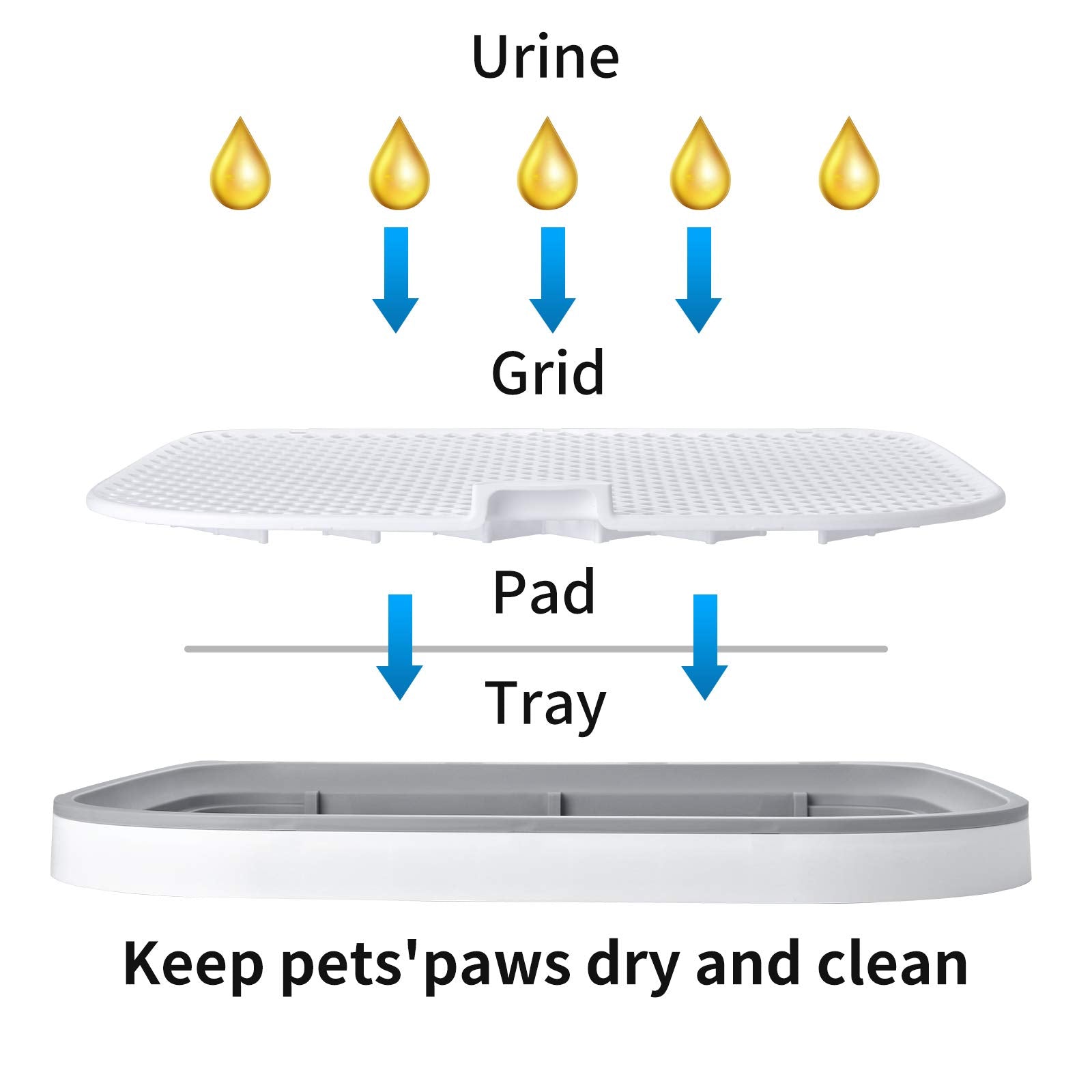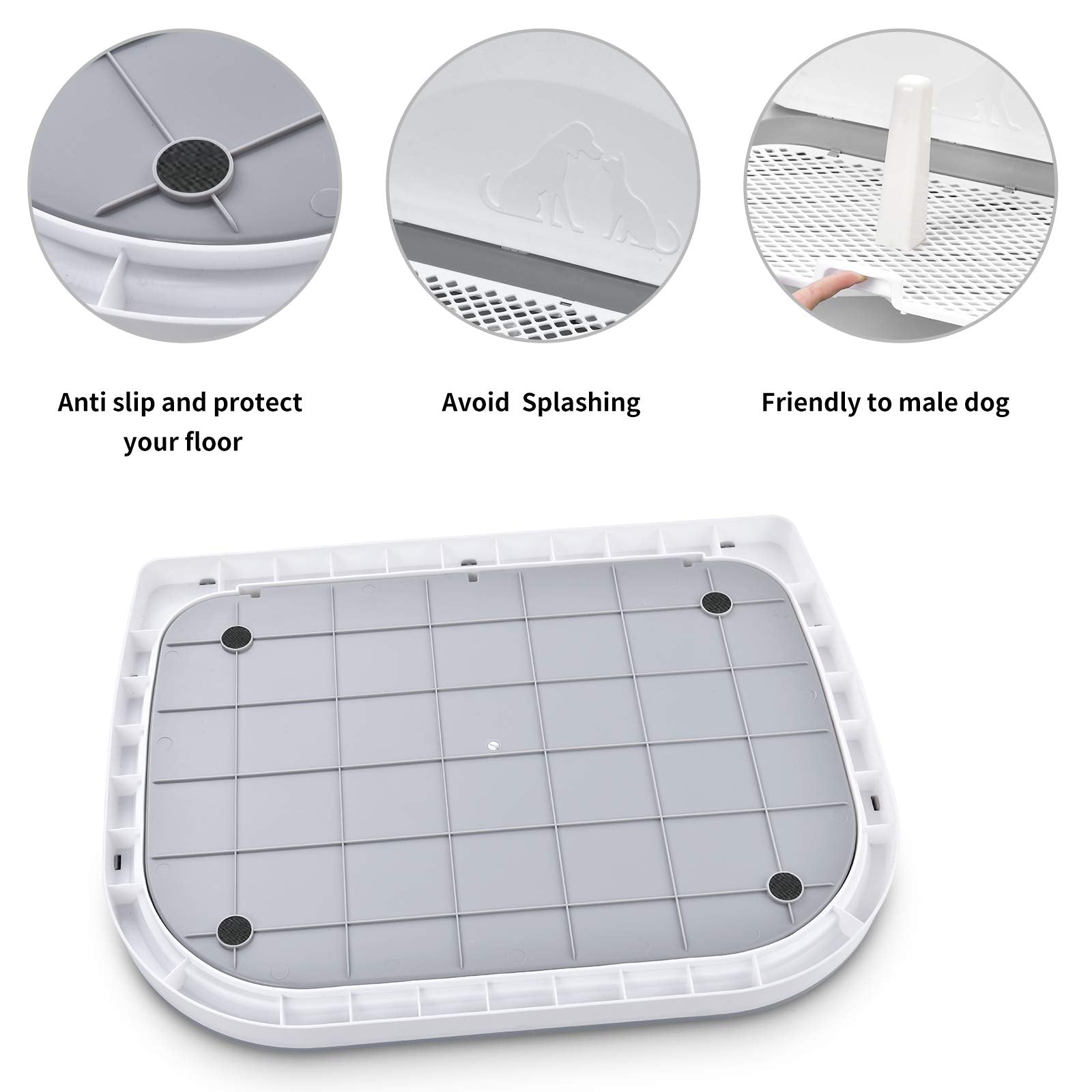 ã€Keep Paws Dry】 Pet Pee Pad Holder will help you train your dog pee in his toilet. Pee will flow directly into the pee tray and your pets'feet can keep dry and clean.Forget the mop from now on! ã€Considerate Design】 Our training tray is made of high quality plastic.Non-toxic,smooth and durable.Fenced design to avoid splashing,removable post is very friendly to male dog.Four anti-slip feet protect your floor. ã€Suitable Mesh of Grid】 The filtering base has a suitable mesh that won’t allow the normal size litter stay upon the grid, which can slightly decrease the stinky smell. Mesh hole is 0.80.8in/22cm. For your pet’s safe, please check the size and confirm the hole will not stuck your pet's feet. ã€Easy to Install and Clean】 Insert the wall and post into the tray then you can get a pet toilet.If it gets dirty, just throw away pee pad and rinse it with water. ã€Indoor / Outdoor Use】 The portable tray makes many locations possible. Essential accessory for every home, especially apartments and condos. Perfect for your bathroom or dog’s playpen / kennel. Outdoor uses include your porch, patio, or deck.