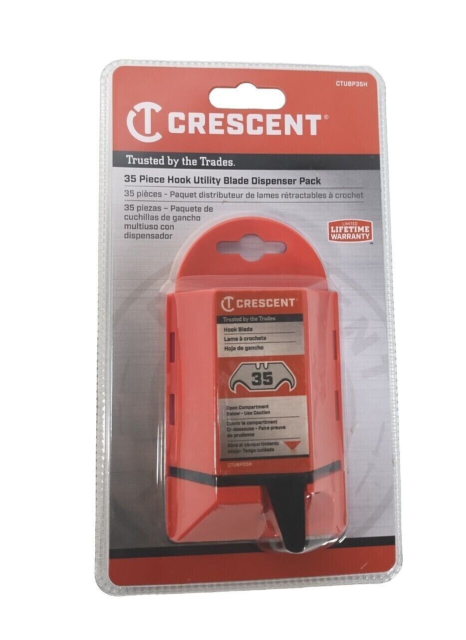 Crescent 35 piece hook utility blade pack in wall mount dispensable holder. Hook blade design great for holding the material for clean rip cuts Designed to fit most standard utility knives Spring loaded blade holder great for quick and easy blade access Convenient wall mounted holder for a safe blade transaction.