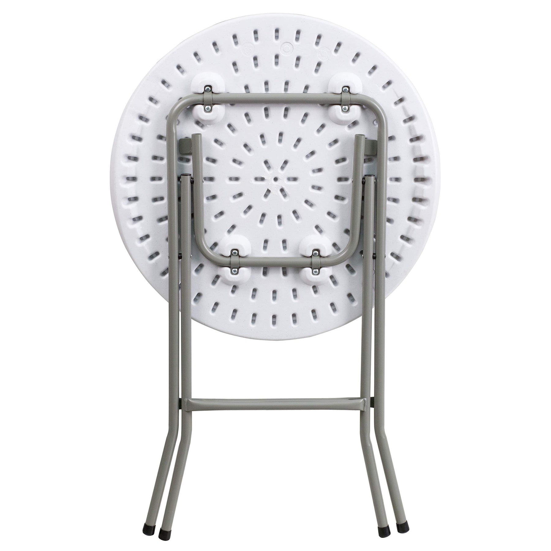 2' ROUND FOLDING EVENT TABLE: Offers a reliable, on-demand solution for when you need a little extra surface space for your guests at indoor or outdoor home, school, or business events VERSATILE USES: Comfortably seats up to 2 people, making it great for a variety of settings such as parties, conferences, barbecues, trade shows, corporate events, training rooms, banquet venues, and much more PORTABLE DESIGN: Foldable table with locking legs allows for easy transportation and compact storage, and the non-marring floor caps protect your flooring surfaces HIGH-QUALITY CONSTRUCTION: Made with a 0.75" thick waterproof and impact and stain-resistant tabletop and durable gray powder-coated locking legs to withstand years of quality use at indoor and outdoor events NO ASSEMBLY REQUIRED: Supports up to 180 lbs. of static weight and measures 24" W x 24" D x 29.375" H with no assembly required, so you can start setting up for events right away