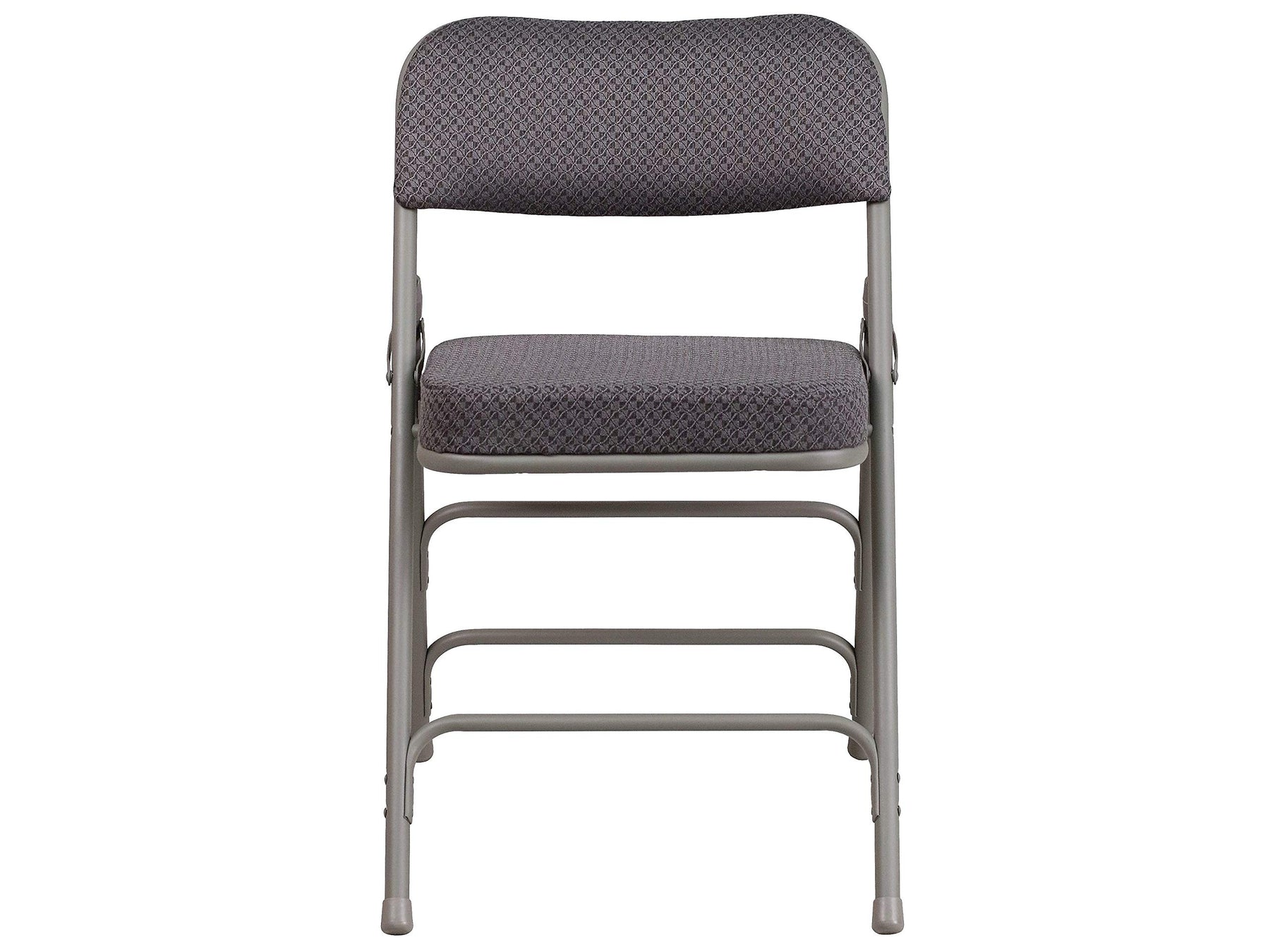 If you want to make your visitors happy you'll need to keep a few of these upholstered metal folding chairs on hand. With an extra thick cushioned seat you can conduct business meetings and game night with ease. Gray patterned fabric upholstery - 2.5" thick foam padded seat - 18 gauge steel frame holds 300 lbs. - riveted steel components - CAL 117 fire retardant foam Suitable for outdoor events - store indoors to protect the frame from extreme moisture Top Review: My friends each ordered one for poker night and after making use of them all of us were pleased. They are very well made and sturdy. The padded seat is really comfortable and holds its shape. PRODUCT MEASUREMENTS: Overall Size: 18"W x 20"D x 29.5"H; Folded Size: 18"W x 3.5"D 37.25"H; Seat Size: 15.75"W x 15.5"D x 19.25"H; Back Size: 18"W x 12"H; No Assembly Required