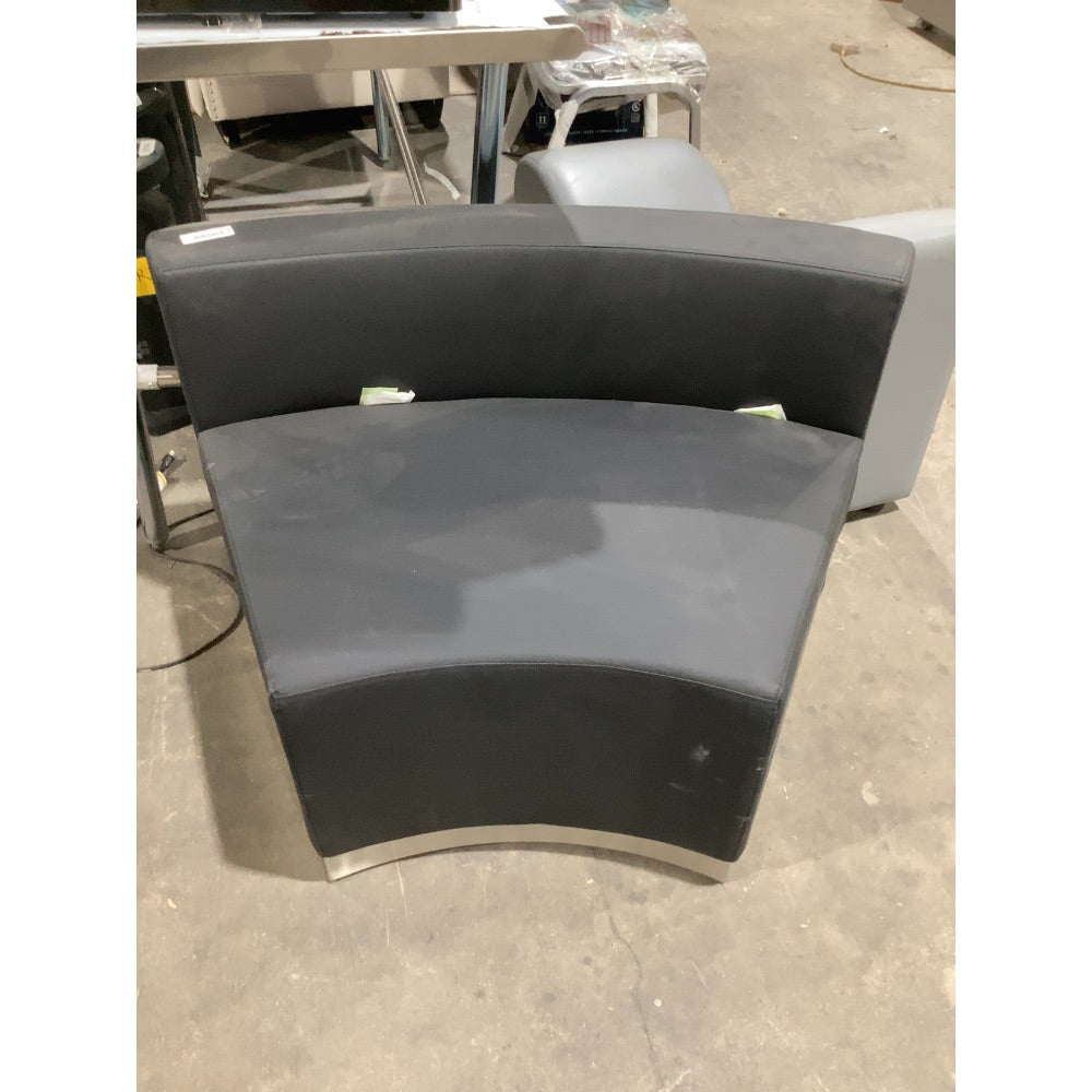 Gray modular seating with curved design.