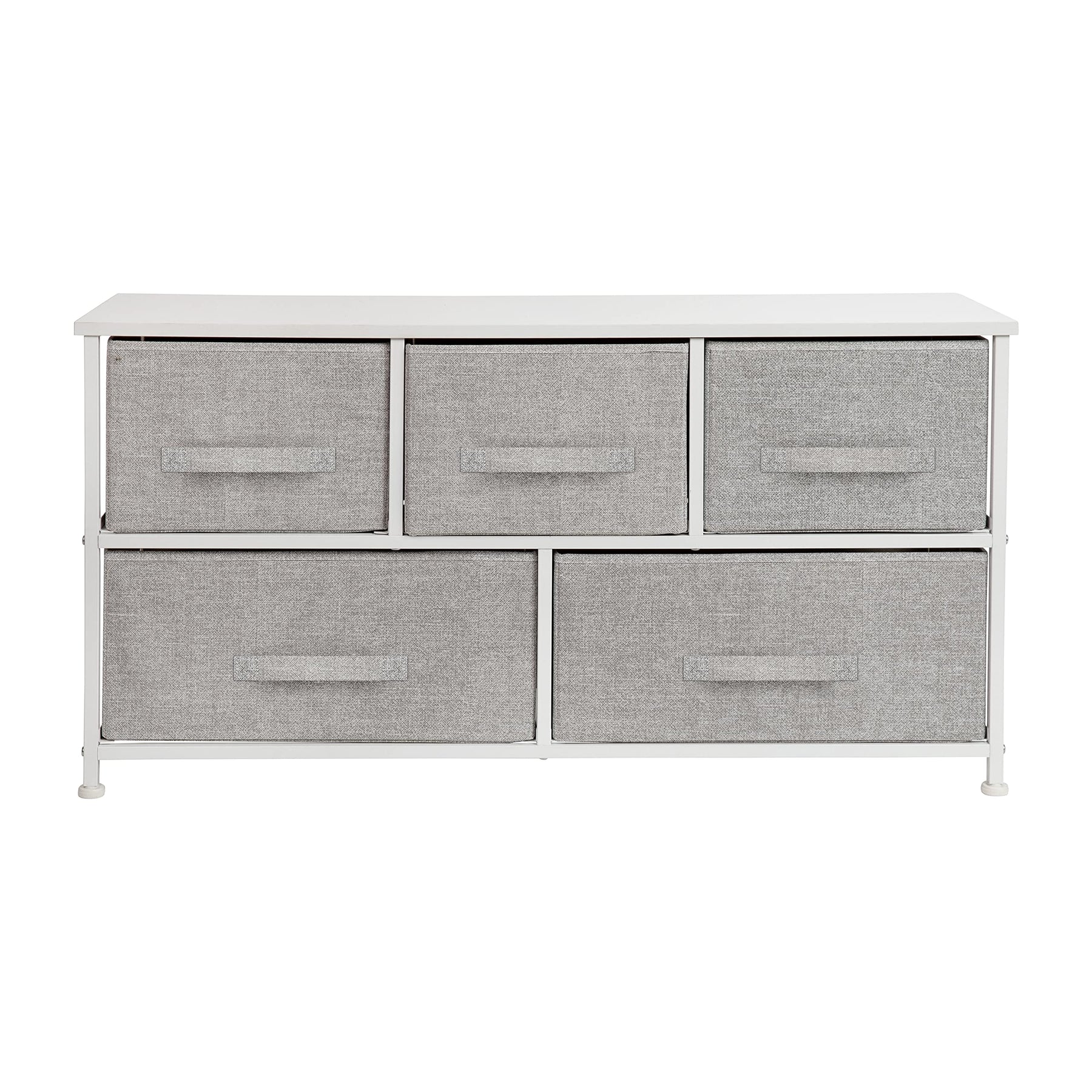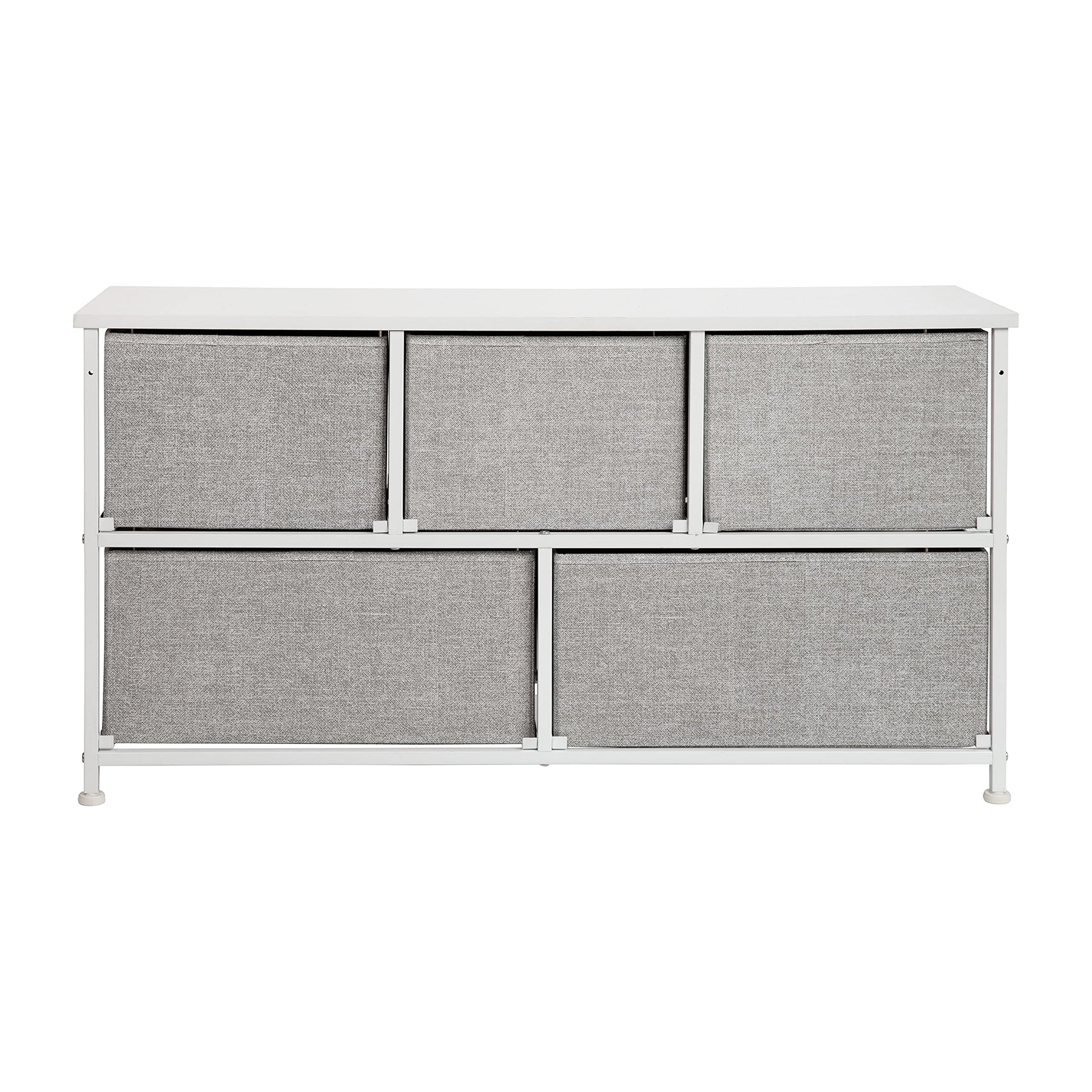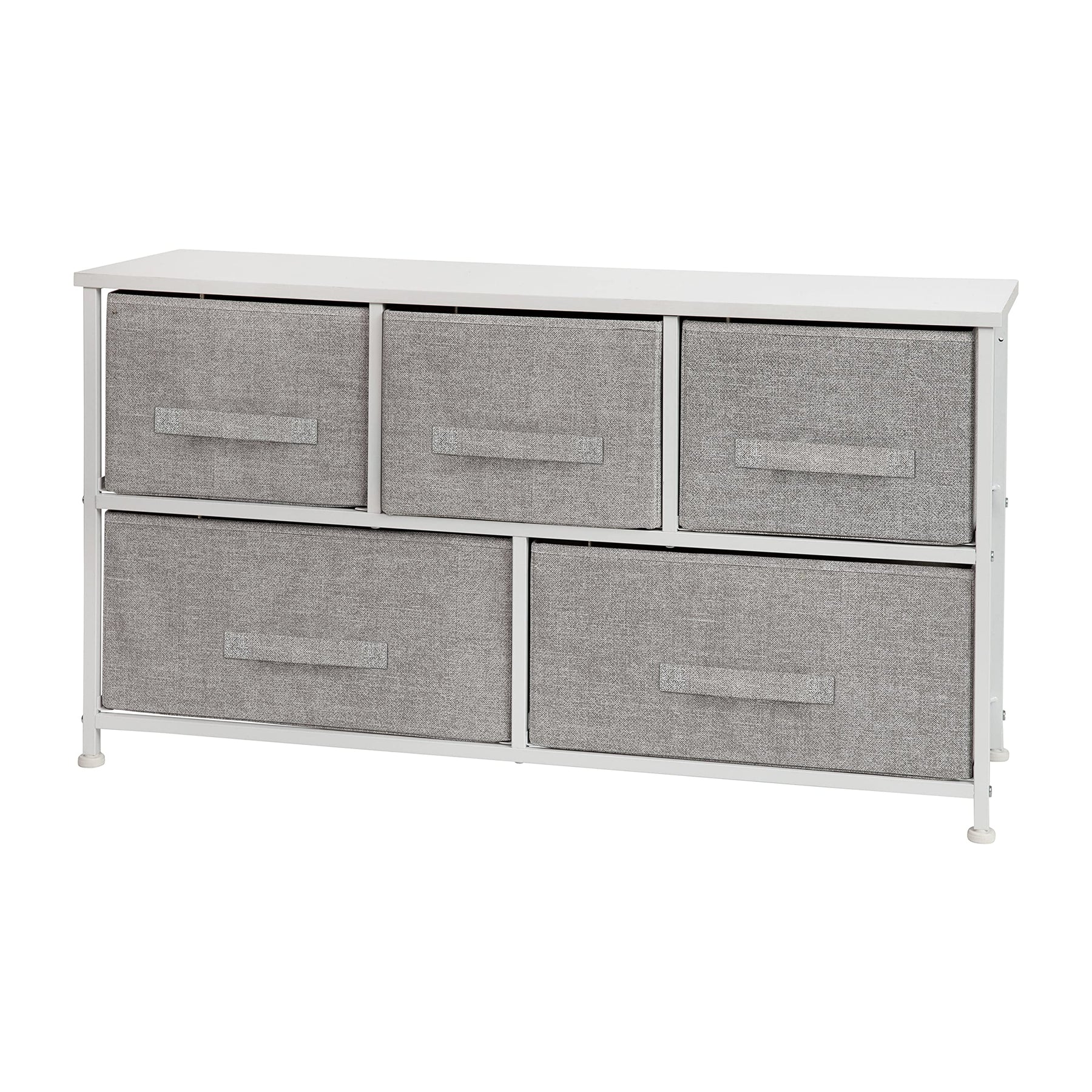 MODERN 5-DRAWER STORAGE DRESSER: Brings seamless storage and organization to any bedroom, mudroom, walk-in closet, nursery, living room, or entryway EASY PULL NON-WOVEN FABRIC DRAWERS: Boasts 5 easy pull light gray non-woven fabric drawers that are fade and stain-resistant to bring modern style to any space VERSATILE STORAGE: Provides endless storage opportunities for clothes, accessories, household supplies, books, and a variety of other storage items DURABLE ENGINEERED WOOD TOP: Constructed with a durable engineered wood top that supports up to 40 lbs. of static weight, offering a convenient display area for small lamps, electronics, picture frames, and other décor EFFICIENT SIZE: Measures 39.5"W x 11.75"D x 21.5"H with three 12"W x 11"D x 8.5"H top drawers and two 18"W x 11"D x 8.5"H bottom drawers to fit neatly in any bedroom while providing plenty of storage space