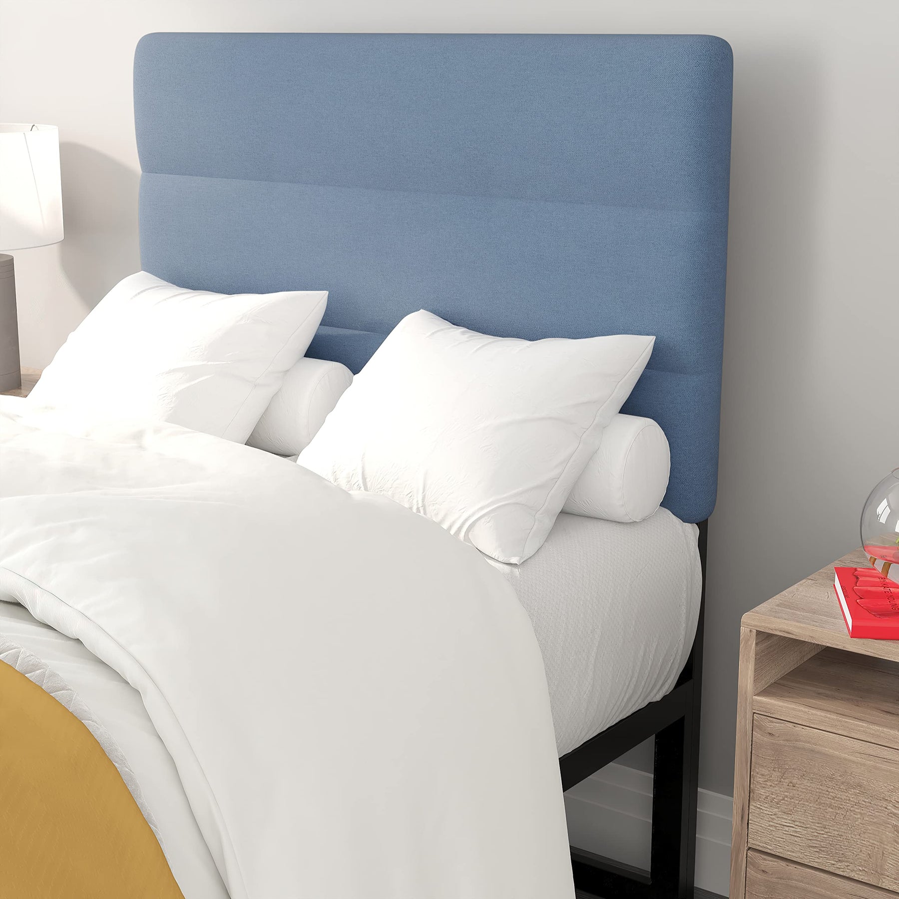 Clean and sophisticated upholstered headboard with universal design ideal for platform or standard bed frames MODERN DESIGN: Adjustable height headboard with horizontal tufted channel stitching in faux linen upholstery DURABLE CONSTRUCTION: Sturdy solid metal frame with pre-drilled legs and plastic floor glides QUICK SETUP: Assembly takes 30 minutes or less, hardware and tools included with step-by-step instructions PRODUCT MEASUREMENTS: Overall Size: 39.5"W x 3.25"D x 44.5-57.25"H