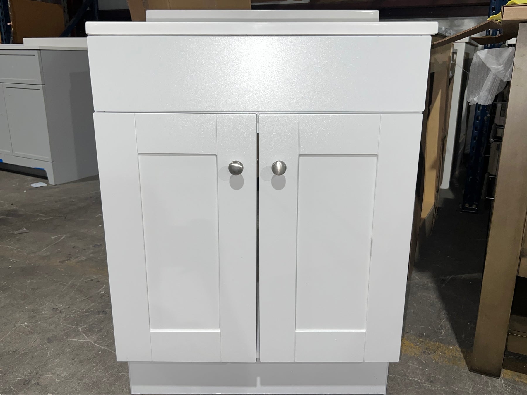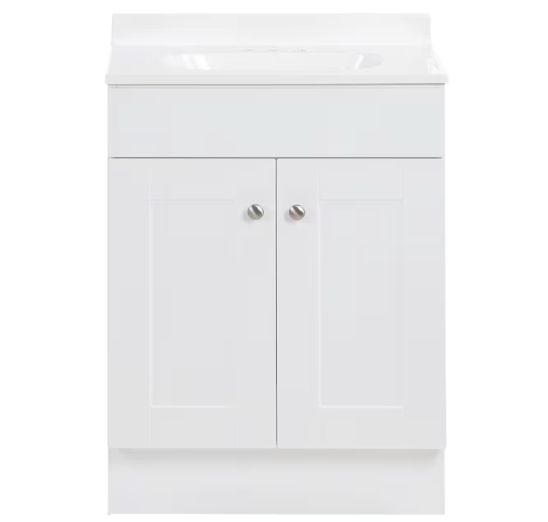 Product: Project Source Dover 24-in True White Single Sink Bathroom Vanity with White Cultured Marble Top (open box)