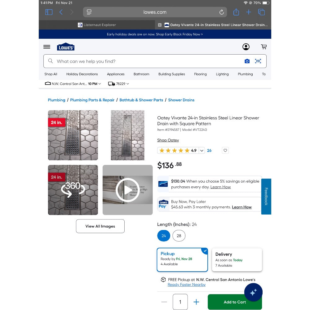 Lot # 1107 Oatey Vivante 24-in Stainless Steel Linear Shower Drain with Tile-In Cover $149