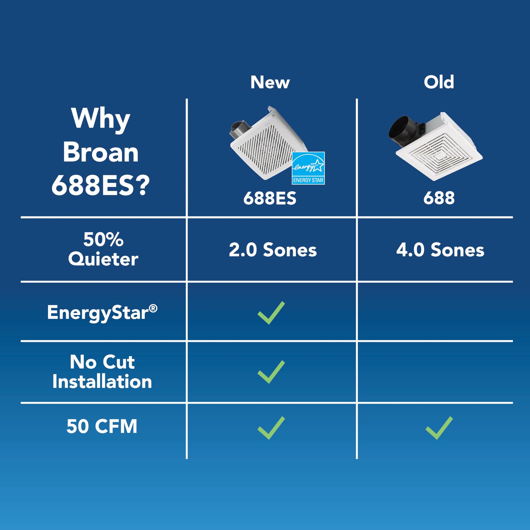 50 CFM BATHROOM EXHAUST FAN: 50 CFM is sufficient ventilation to remove, moisture, odor and pollutants from your smaller powder room or bathroom up to 45 sq. ft. EFFICIENT BATHROOM EXHAUST FAN: Energy Star Certified, operates at 2.0 Sones for peaceful and effective ventilation. EASY INSTALLATION: Compact housing with foldable mounting brackets for NO CUT and versatile installation with no attic access needed. Housing Dimensions 7-1/4 " x 7-1/2" x 3-5/8". Cover dimensions. 8-5/8"x8-3/8". 3 " diameter duct. UPDATED MODERN GRILLE: Brighter white grilles blend in to match most common ceiling paint. Broan 688. This fan features foldable mounting ears and easy to remove grill cover with springs. BROAN NUTONE: This new innovative product from Broan NuTone, the leaders in indoor air quality, is proudly MADE IN THE USA at our Hartford, WI headquarters