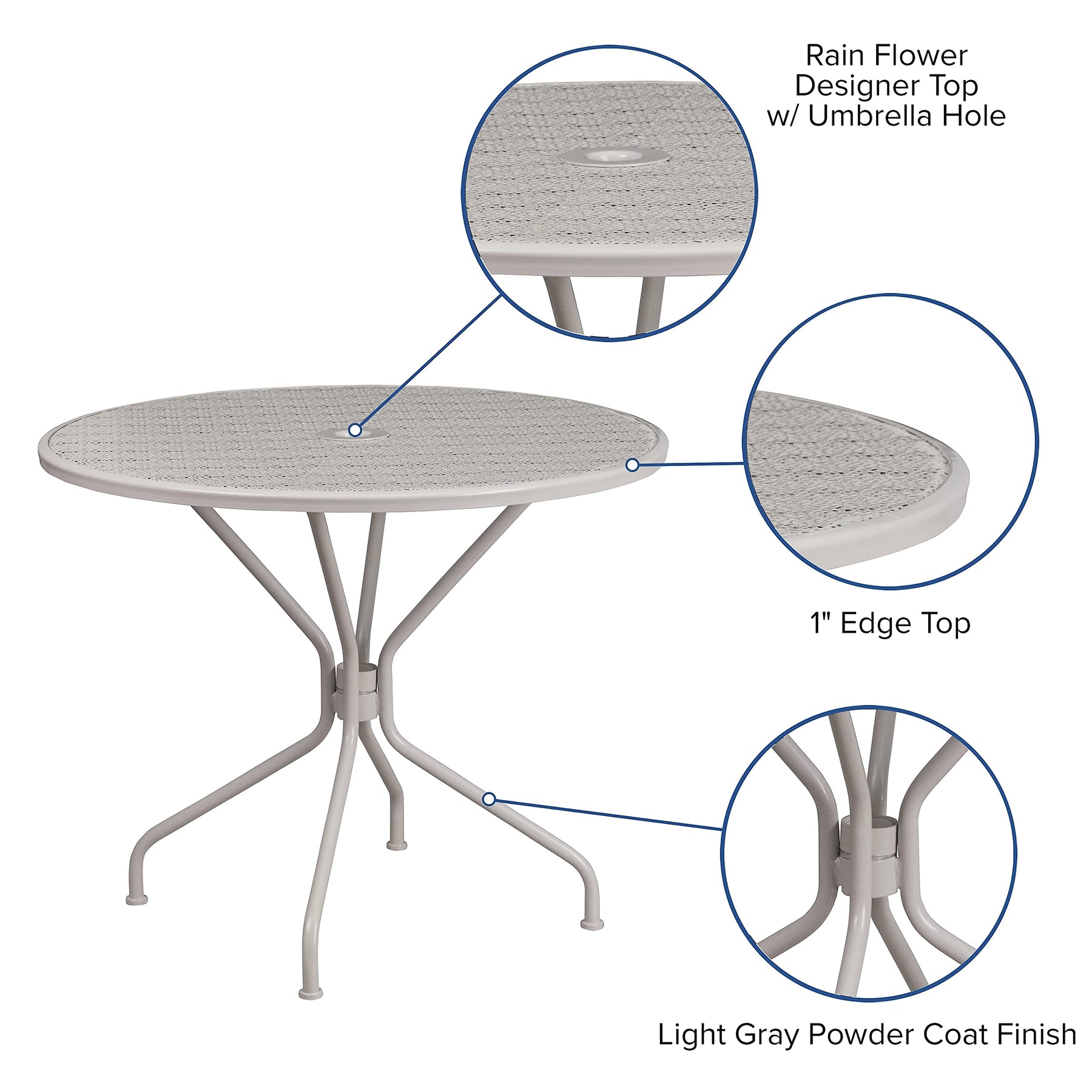 When you want your outdoor living space to be more than just where the grill sits, this exquisite table will make your patio or deck come alive. This designer table shows you have exceptional taste that never goes out of style. Rain flower designer top with umbrella hole Light gray powder coated frame finish, holds up to 150 lb. weight capacity Contemporary patio table for commercial and residential use PRODUCT MEASUREMENTS: Overall Size: 35.25"W x 35.25"D x 28.75"H
