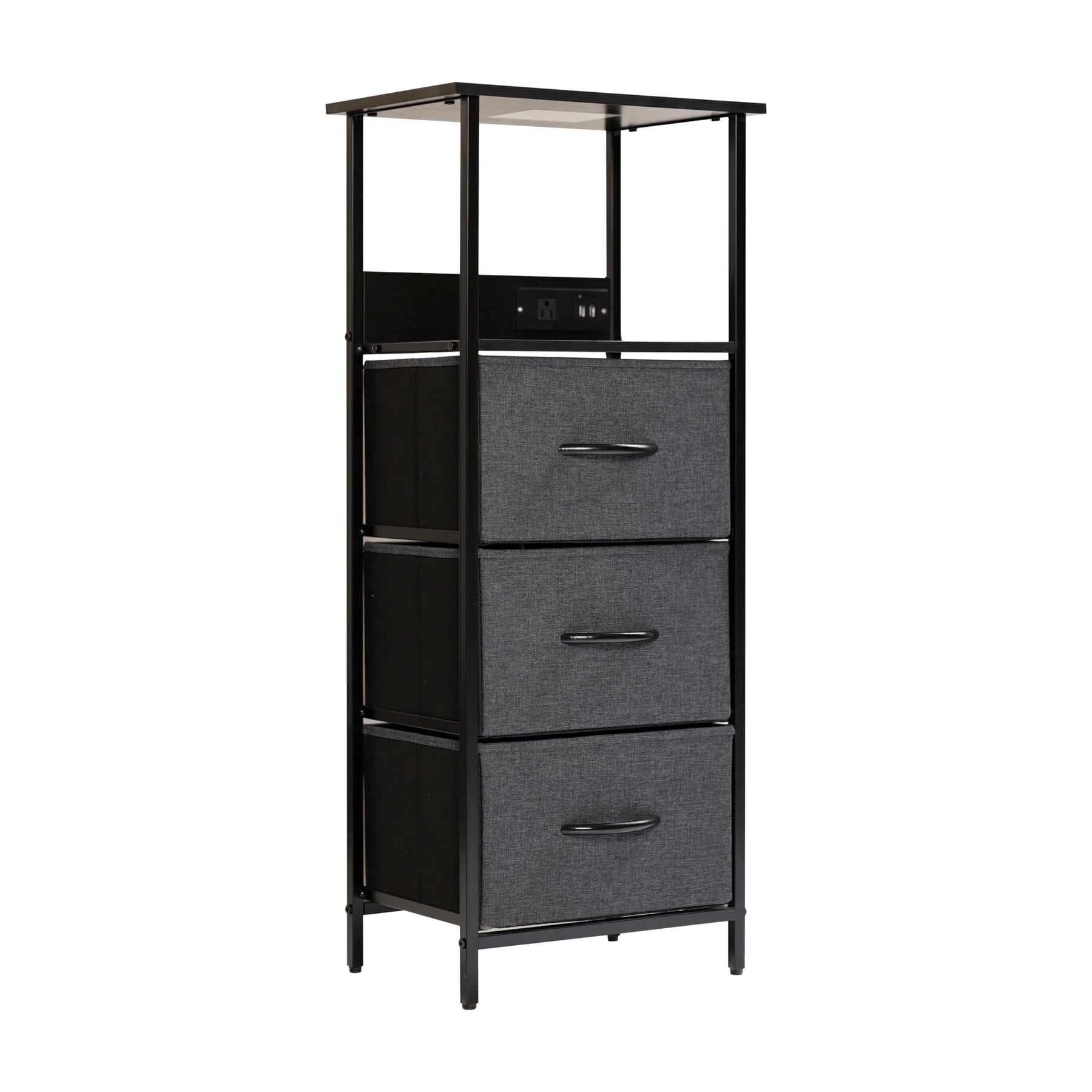 VERSATILE STYLE & UTILITY: Organize your space and charge up your devices with this nightstand that can be used as a dresser or side table and features a charging station with two USB ports and one power outlet SPACE-SAVING DESIGN: Store your belongings with ease thanks to three spacious fabric drawers with wood handles and an engineered wood top and backboard designed to prevent small items from falling behind your nightstand STURDY CONSTRUCTION: A powder-coated metal frame is engineered to hold up to 40 lbs. static weight while handrails on top make it easy to grip and move, and adjustable floor glides are helpful in leveling this piece on uneven flooring QUICK ASSEMBLY, EASY UPKEEP: With all necessary tools and hardware included, setup can be done in ten minutes or less while cleaning is just as easy by wiping with a damp cloth PRODUCT MEASUREMENTS: 15.75"W x 10.75"D x 37.75"H; Drawer Size (3): 12.75"W x 9.75"D X 7.75"H