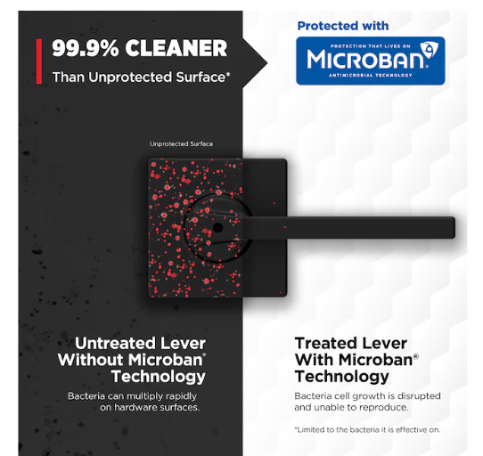 Microban Antimicrobial product protection keeps door hardware 99.9% cleaner than unprotected surfaces