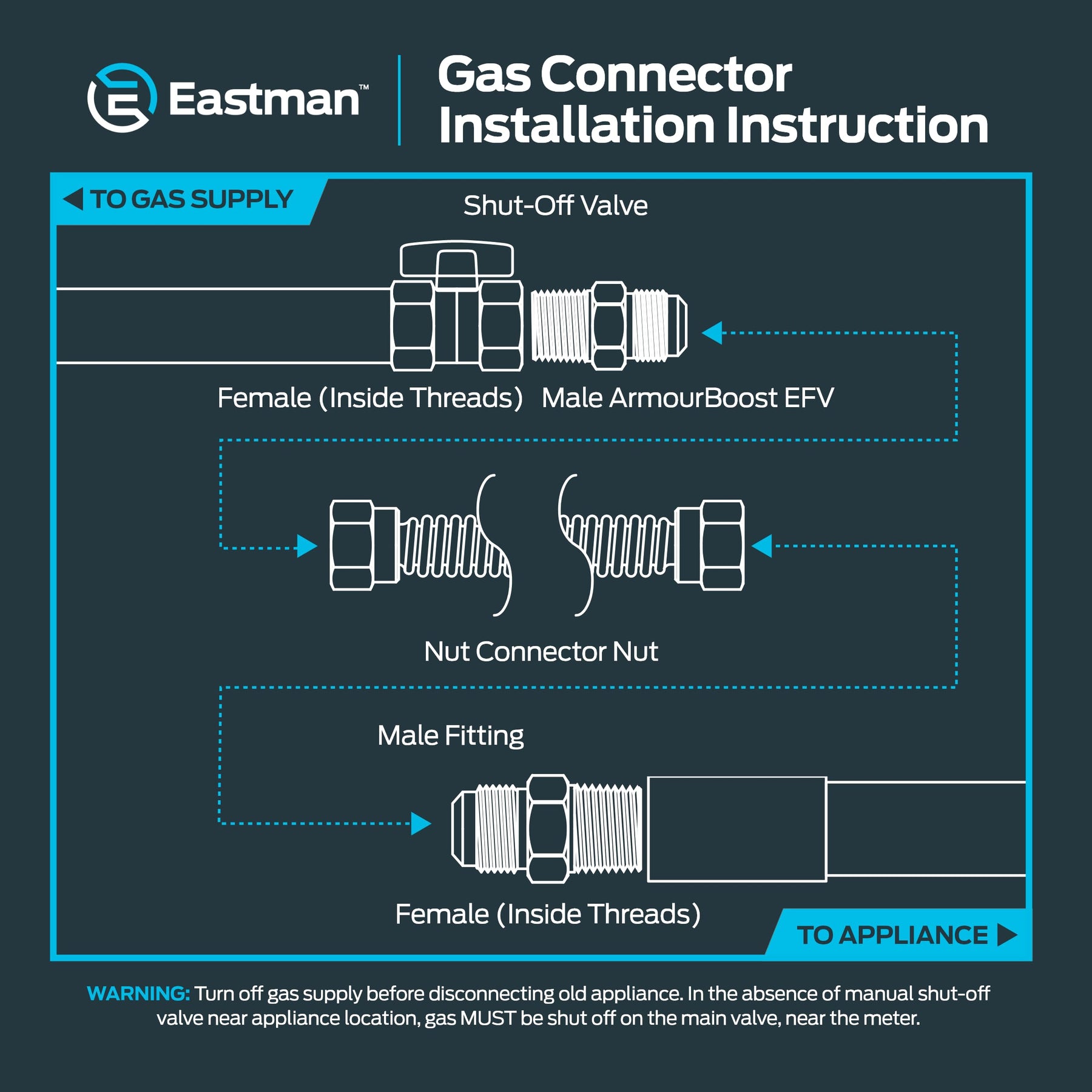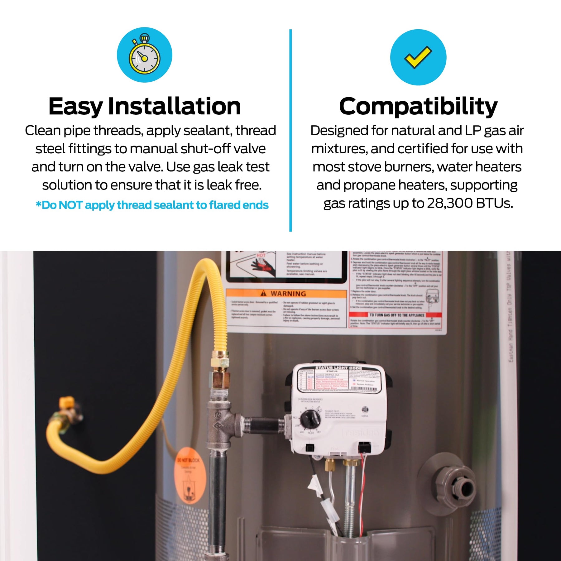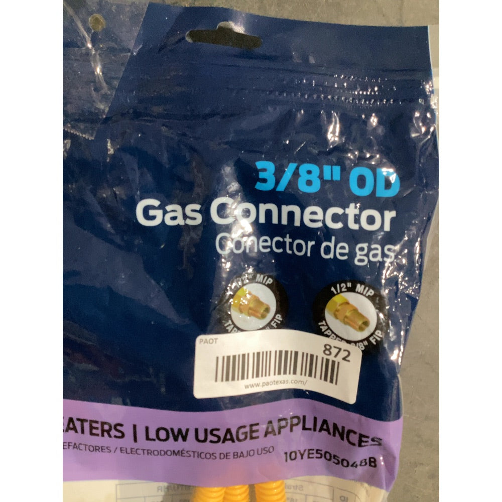 CONNECTS GAS APPLIANCES: Flexible 48 in stainless steel connector supplies natural gas or propane to appliances such as gas logs, fireplaces, and heaters DURABLE CONSTRUCTION: Built with stainless steel and deep corrugations for flexibility; epoxy coating adds protection from disintegration, household stains, and UV rays EASY INSTALLATION: No special tools required; clean pipe threads, apply sealant, connect fittings to shut-off valve, and test with leak solution COMPLETE KIT: Includes one 48 in x 3/8 in OD epoxy-coated stainless steel connector with 1/2 in MIP x 1/2 in MIP threaded ends; shut-off valve not included PERFORMANCE SPECS: Certified for use with natural and LP gas appliances; supports up to 33,400 BTUs for residential low-usage gas applications