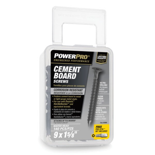 Power Pro Cement Board Screws are ideal for fastening cement board to wood or light-gauge metal studs. These screws work great in all cement board brands. The innovative design outperforms the competition, providing a faster, easier-to-drive solution for the professional. Items come in convenient reusable, stackable plastic with a T20 Pro-Stik bit, offering stable driving and one-hand operation.. Features TEXTURED HEAD: Improves mortar adhesion; STAR DRIVE: No stripping, 6 points of contact; AGGRESSIVE COUNTERSINKING BLADE SYSTEM: Prepares head for flush countersinking; TWIST SHANK: Prevents board cracking and clears out debris; HIGH-LOW THREAD DESIGN: Drives clean and fast through dense cement board material; SELF-PIERCING POINT WITH TYPE 17 CUT: Quickly pierces wood & metal studs (26-20 gauge) and clears out debris; CORROSION RESISTANT: Gray epoxy coating is recommended for interior/exterior applications and treated lumber; Recommended for 1/2" cement board, box contains enough screws to install six (6) 3' x 5' boards; Specifications Primary Color: Gray; Base Material: Carbon Steel; Thread Type: Dual Lead Serrated Threads; Finish: Epoxy Coated; Diameter: No.9; Product Length: 1-5/8"; Head Type: Modified Wafer with Blades; Drive Style: Star; Interior-Exterior: Exterior; Product Size: No.9 x 1-5/8"; Point Type: Type 17; Weight: 1.2 lbs;.