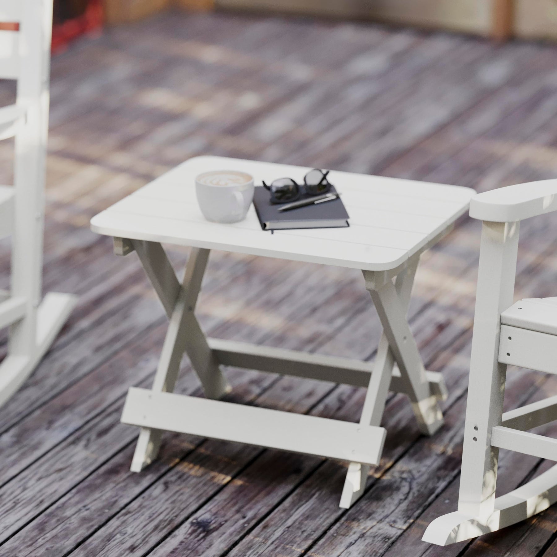 SPACE SAVING: Portable Adirondack style side table blends seamlessly with other furniture and folds for compact storage or transport ideal for patios, camping, or backyard barbecues ALL WEATHER DURABILITY: UV fade and weather resistant poly resin composition withstands the elements from snowy winters to hot summers with no peeling, chipping, or cracking for year-round use DEPENDABLE CONSTRUCTION: Lightweight portable design for easy transport but strong enough to hold up to 50 lbs. static weight LOW MAINTENANCE: Arrives fully assembled simply unlock and unfold for use and wipes clean with a damp cloth PRODUCT MEASUREMENTS: Overall Size: 20"W x 16.25"D x 18"H