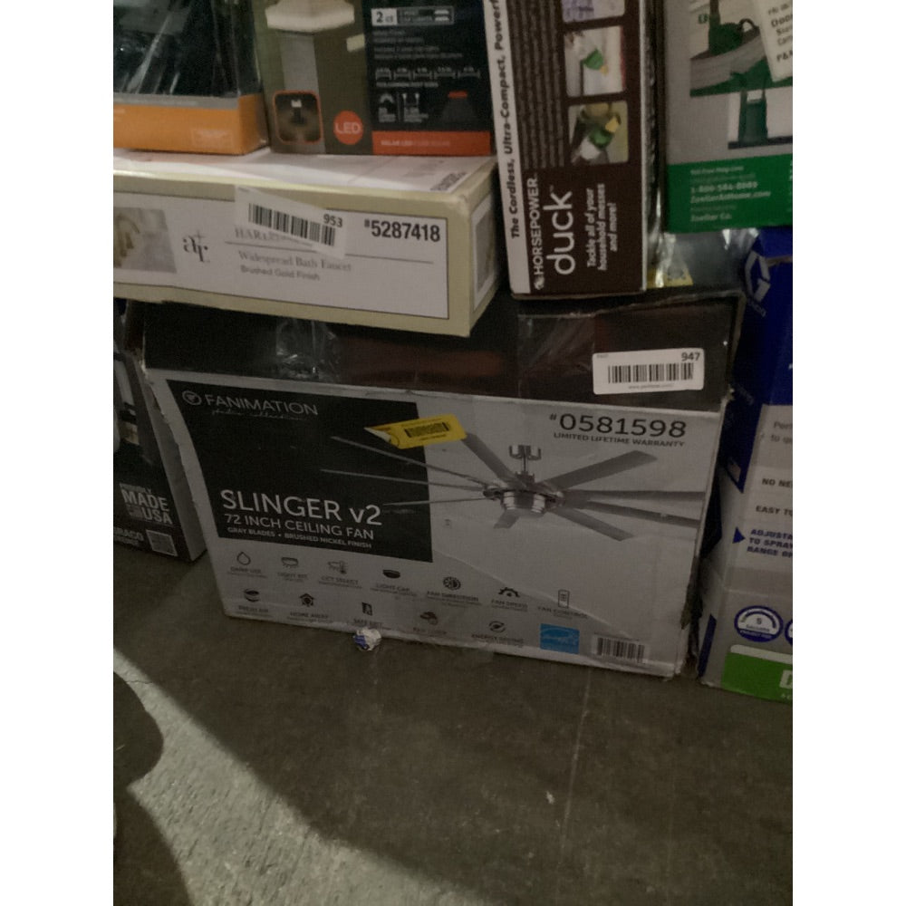 Fanimation Slinger 2 modern stainless steel 8 blade fan Collection Name Slinger v2 Fan Diameter (Inches): 72 Downrod Length (Inches): 6 Number of Blades: 9 Reversible Blades: No Blade Finish: BRUSHED NICKEL Light Kit Included Number of Bulbs Required: 1 Number of Lights: 1 Lighting Technology: Integrated LED Light Bulb Base Type: LED Recommended Light Bulb Shape: Single Maximum Bulb Wattage: 18 Bulb Type: LED Remote Control Included: Yes ENERGY STAR Qualified: Yes High Speed Airflow (CFM): 9000 High Speed Electricity Use (Watts): 30 Mounting Options: Downrod mount Motor Speeds: 6 Reverse Air Flow: Yes Works with Iris: No Motor Type: DC Angle Mount Capable: Yes Manufacturer Color/Finish: Brushed nickel Dual Fan Heads: No Wattage Equivalent: 1 UL Safety Listing: Yes CSA Safety Listing: No ETL Safety Listing: No Remote Control: Handheld Package Quantity: 1 Light Kit Type: Integrated Commercial/Residential: Commercial/Residential ENERGY STAR Certified: Yes Minimum Height (Inches): 15.65 Maximum Height (Inches): 83 Fixture Finish: Brushed Style: Contemporary/Modern Outdoor Usage Rating: Damp location Shade Material: Glass Indoor/Outdoor: Indoor/Outdoor Glass Type: N/A Fixture Color Family: Nickel Suggested Room Size: XLarge Room (over 400 sq. ft.) Frosted Glass:Yes.
