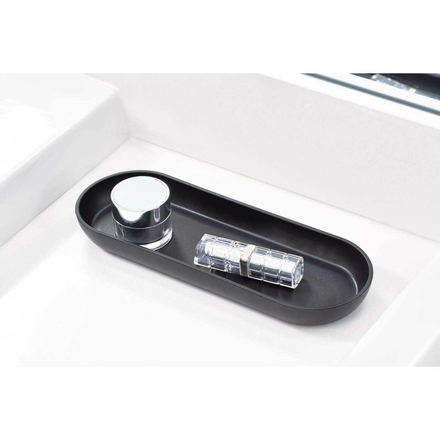 Bathroom countertop accessory set includes black plastic soap dispenser pump, toothbrush holder, canister, and tray for holding smaller items or keeping the set together Soap dispenser is designed with a wide opening to make refilling up to 12 ounces of your favorite soap or lotion easy Toothbrush holder features 4 slots for multiple toothbrushes to accommodate the entire family Canister can be used for holding q-tips, cotton balls, hair accessories, makeup brushes, cosmetics, and more Measures 9.63" x 3.5" x 6.39", perfect for your bathroom or vanity countertop