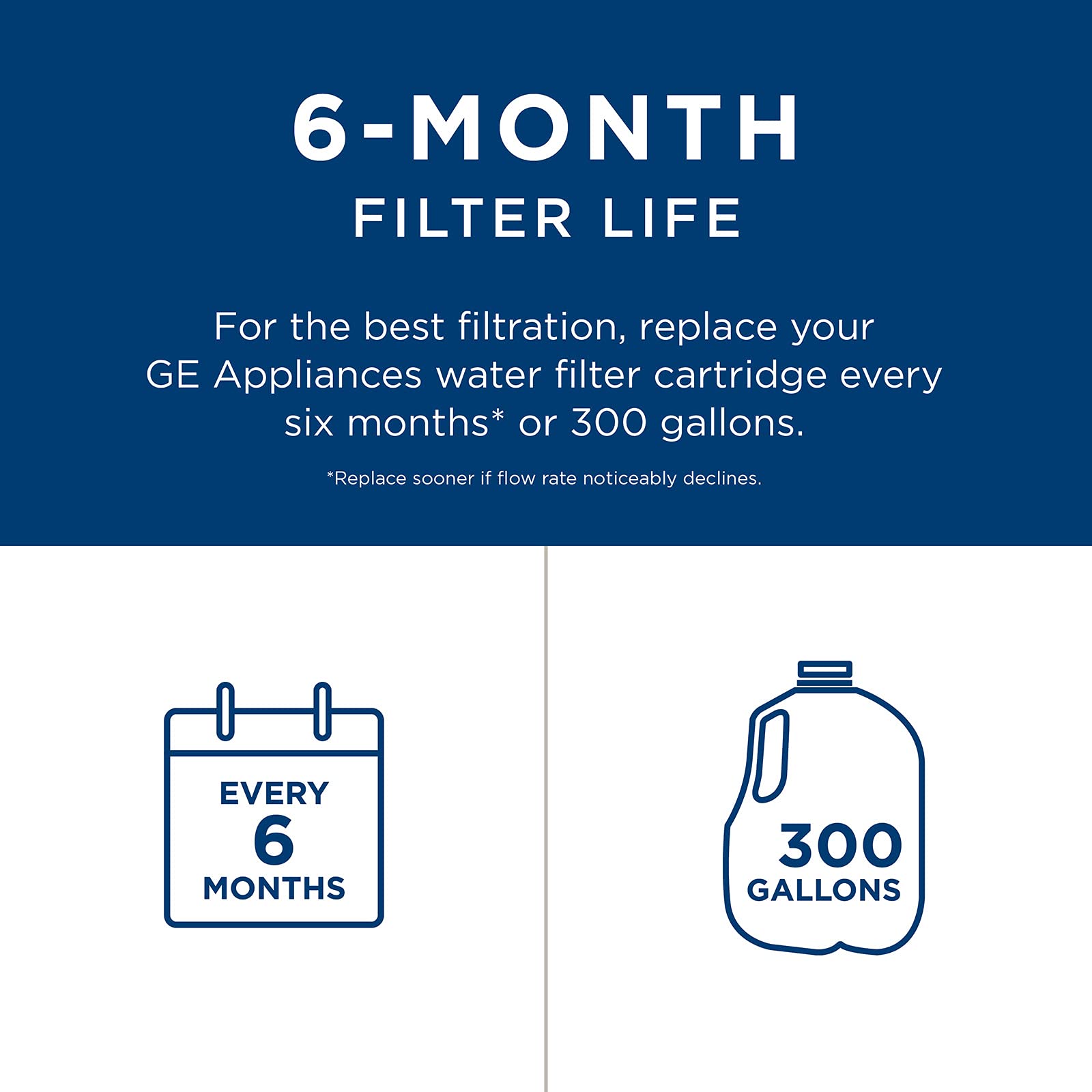 GE’s most advanced filtration ever with easy tool-free replacement. Tested and verified to filter 5 trace pharmaceuticals including ibuprofen, progesterone, atenolol, trimethoprim, and fluoxetine ( The contaminants or other substances removed or reduced by this water filter are not necessarily in all users’ water) NSF certified to filter contaminants such as cysts, lead, mercury, asbestos, and select pesticides and chemicals NSF certified for structural performance and to filter chlorine taste and odor and particulates 6 month filter life (cartridge should be replaced every 6 months at a rated capacity, or sooner if a noticeable reduction in flow rate occurs)