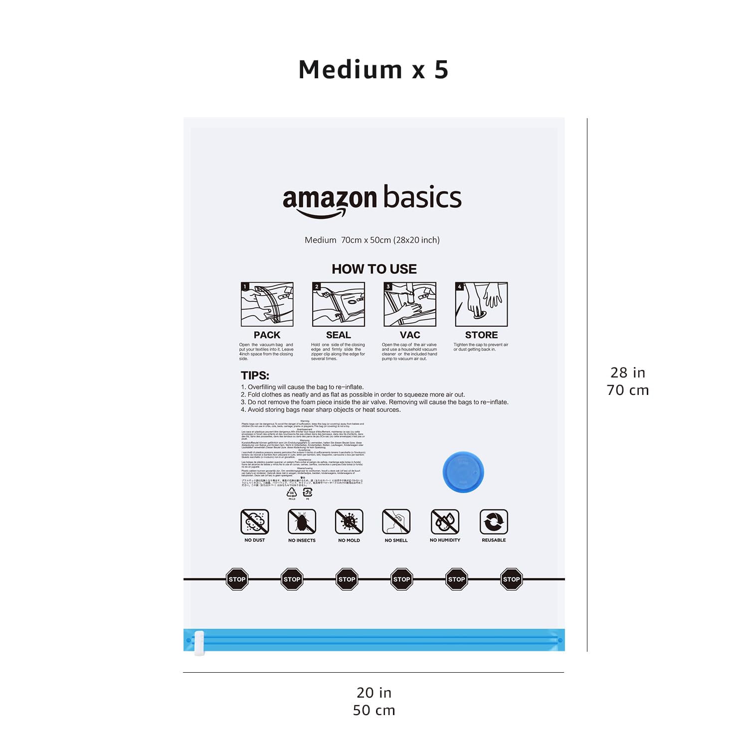 5-pack of Medium size vacuum storage compression bags for storing off-season clothes, towels, linens, and more Vacuum seal bags save space by effectively compressing bulky textiles down 80% for compact, stackable storage under beds, in wardrobes, closets, cupboards, or suitcases Heavy-duty double-zip seals and triple-seal turbo valve for lasting airtight protection; follow instructions printed on storage bags to ensure correct sealing when using Durable, reusable space-saver bags are made with thick layers of PA and PE films, which improve tear and wear resistance. Includes hand pump for efficient suction of air and convenient use while traveling; valve can also be connected to a standard vacuum cleaner hose for faster deflation Bag Dimensions: 28 x 20 inches Note: Suggest to use vacuum cleaner to vacuum a Large, Jumbo or X-jumbo bag for fast result
