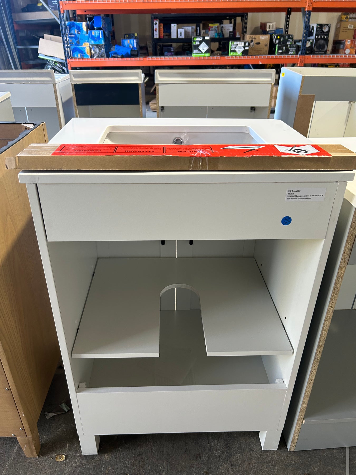 Product: Style Selections Dolton 24-in True White Undermount Single Sink Bathroom Vanity with White Engineered Stone Top (damaged)